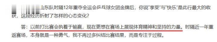 在东谈主民日报的这篇专访里,她句句不提孙颖莎,却字字齐绕不开这位相互配置的敌手。