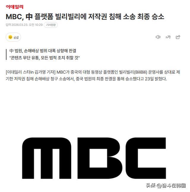韩国MBC于23日晓示,在针对中国大型视频平台哔哩哔哩(BiliBili)运营方拿起的著述权侵权挫伤抵偿诉讼中,最终通过中司法院的终审判决取得胜诉。