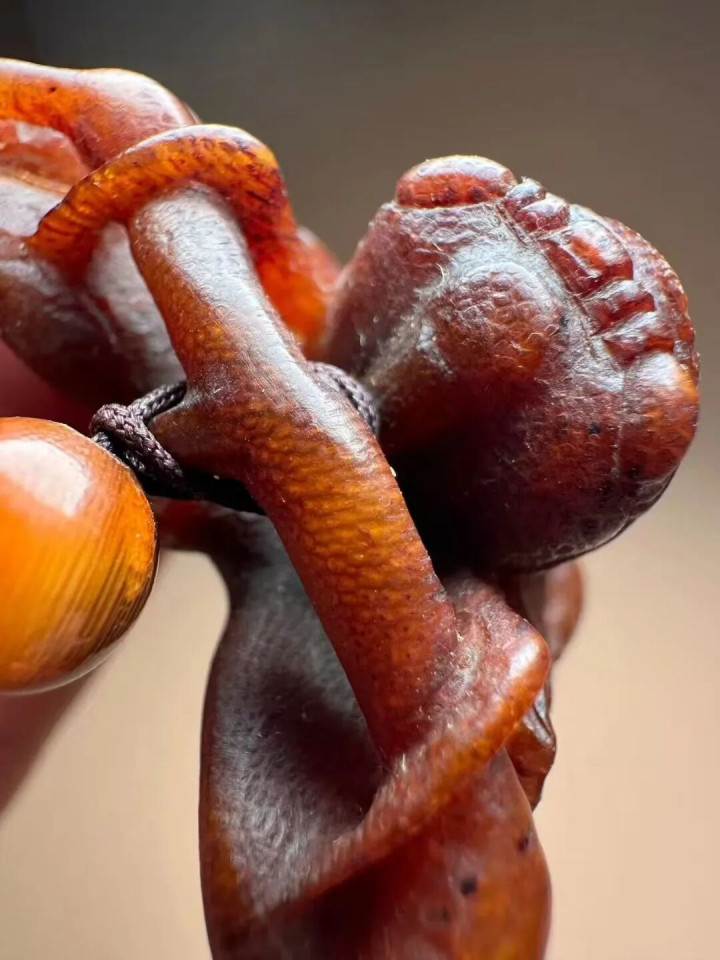 私东谈主保藏的一款百年老犀角雕一鸣惊东谈主赏析。角质感如同久经盘玩的大年份老蜜蜡,景况仍是充分氧化变色,通体呈现古铜红色。