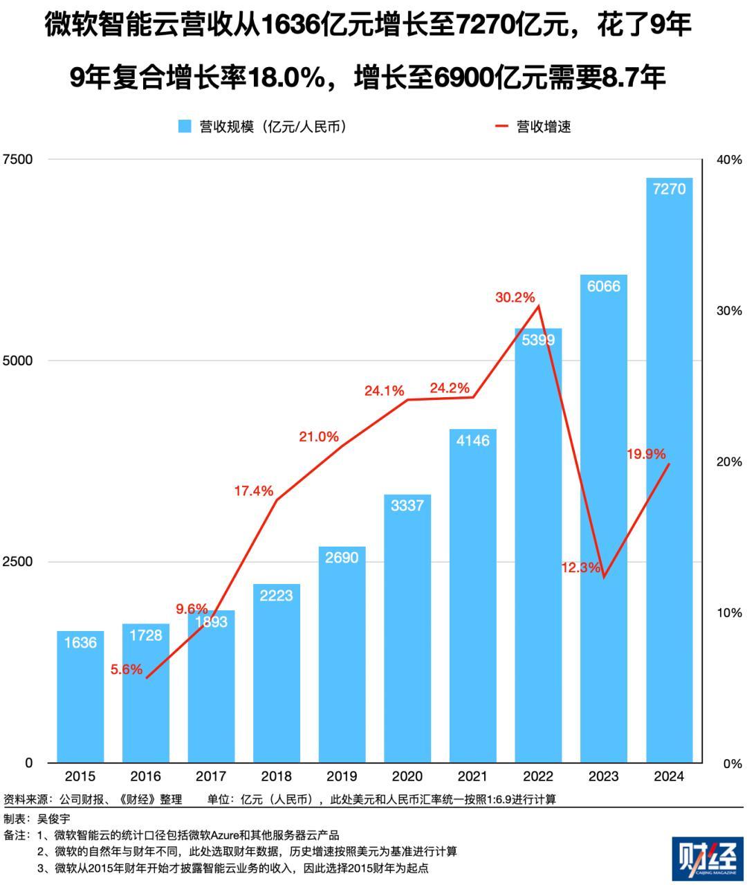 2015财年-2024财年(2014年7月初-2024年6月末),微软智能云的营收从1636亿元增长至7270亿元。这花了9年,9年复合增长率18.0%。照此蓄意,从1636亿元增长至6900亿元,简略用了8.7年。