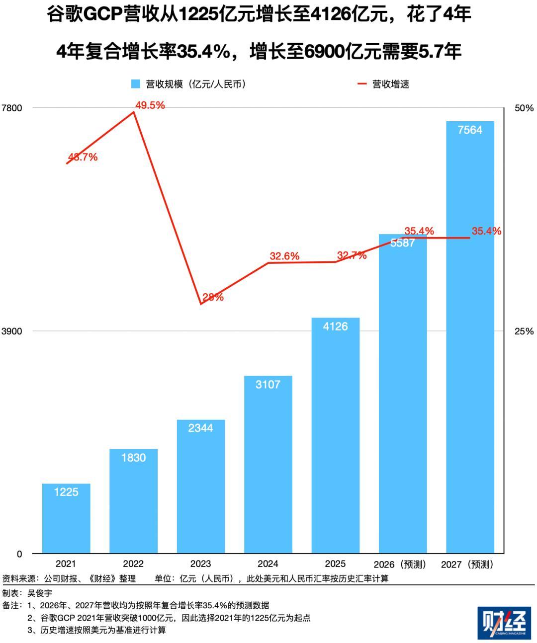 2021年-2025年,谷歌GCP的营收从1225亿元增长至4126亿元,4年复合增长率35.4%。照此蓄意,从1225亿元增长至6900亿元,简略需要用5.7年。