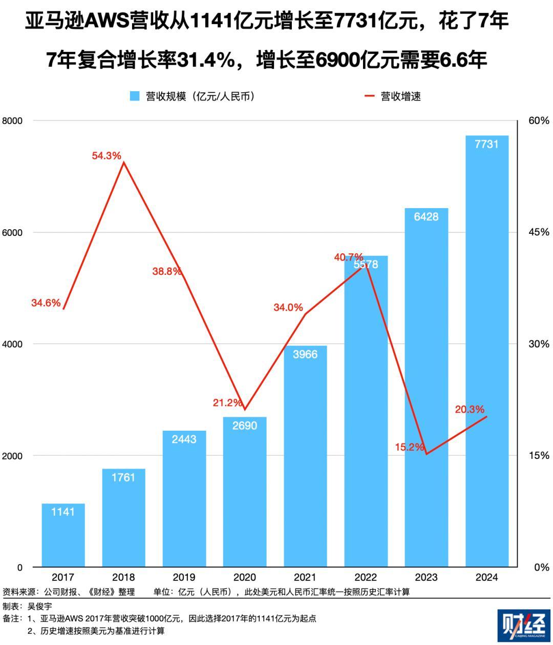 2017年-2024年,亚马逊AWS的营收从1141亿元增长至7731亿元。这花了7年,7年复合增长率约31.4%。照此蓄意,从1141亿元增长至6900亿元,简略用了6.6年。