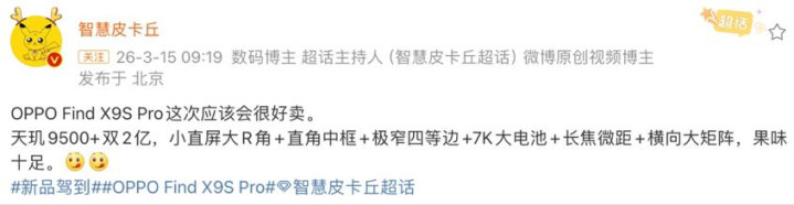 字据博主@聪敏皮卡丘 的音问,Find X9s Pro摄取小直屏大R角筹办,中枢搭载天玑9500惩办器,同期还会带来一系列旗舰堆料。