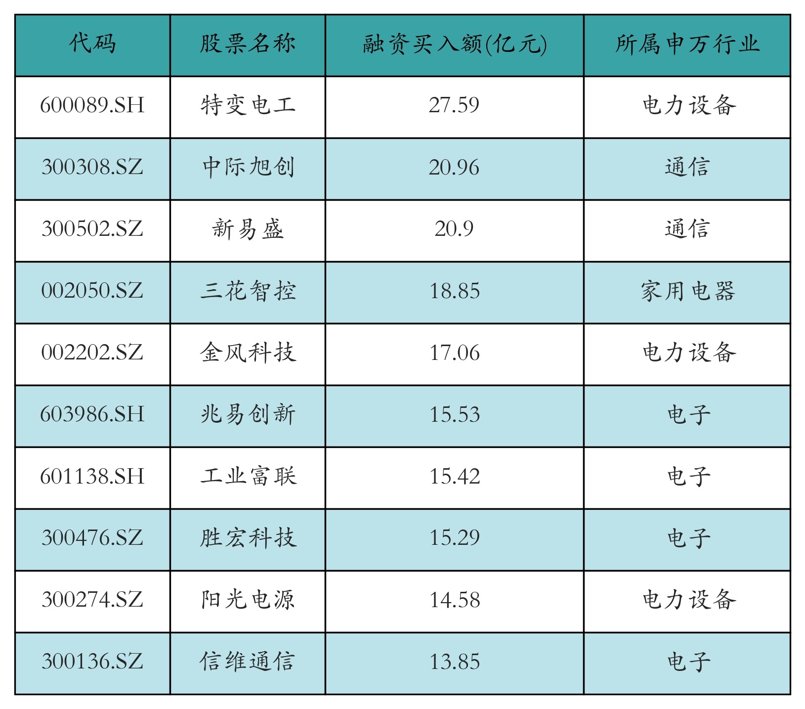 两市共有3476只个股有融资资金买入,其中特变电工、中际旭创、新易盛排行前三,买入金额分裂27.59亿元、20.96亿元、20.9亿元。融资买入额前10个股细目见下表: