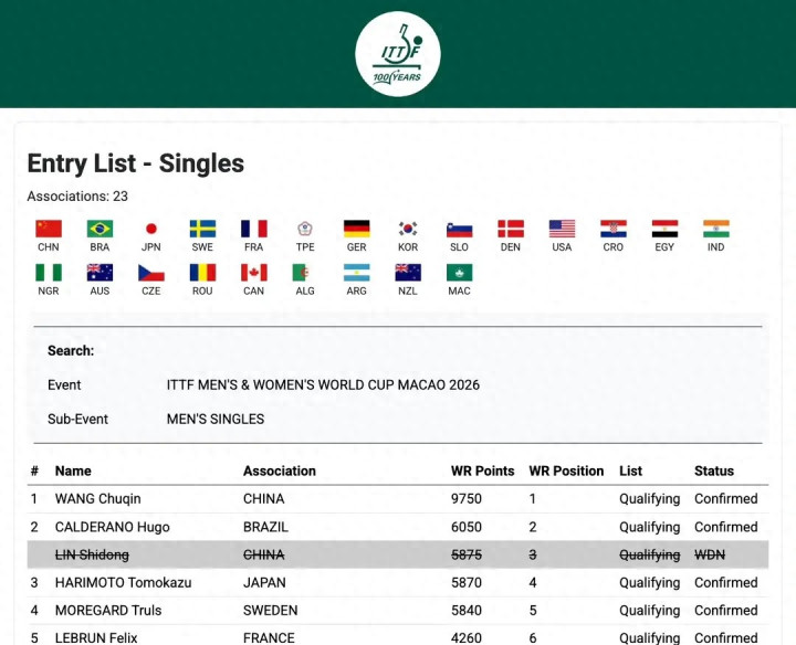 3月24日,海外乒联官网更新参赛名单,20岁的国乒选手林诗栋厚爱退出3月30日开赛的2026年澳门单打寰宇杯。这是他短期内第二次缺席重磅赛事,此前他照旧因躯壳原因错过WTT重庆冠军赛,短短一个月连退两站顶级比赛。跟着林诗栋退赛,中国香港球员林兆恒取得递补参赛履历,告成入围正赛名单。3月23日公布的最新寰宇排行里,林诗栋的位置从第三下滑至第五,也平直失去了澳门寰宇杯的种子选手履历。也曾站上寰宇第一的年青选手,如今正碰到事业生活里第一次实在的逆境。