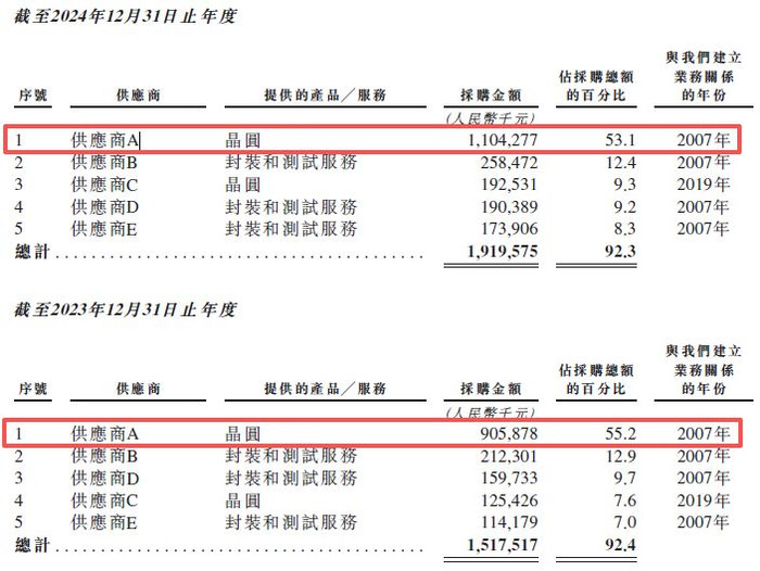 采购明细数据走漏,“供应商A”的晶圆代工场在圣邦股份的供应链体系中占据了首要隘位。2023年,圣邦股份向“供应商A”的采购金额为9.06亿元,占昔日公司总采购额的比例达到55.2%。2024年,圣邦股份向“供应商A”的采购范围进一步扩大至11.04亿元,采购占比仍是看守在53.1%的高位。