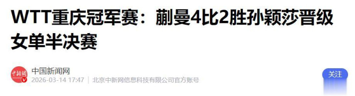 中国新闻网——WTT重庆冠军赛:蒯曼4比2胜孙颖莎晋级女单半决赛
