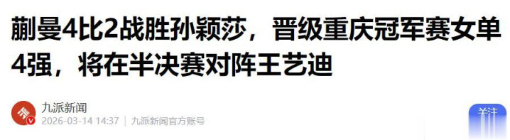 九派新闻——蒯曼4比2校服孙颖莎,晋级重庆冠军赛女单4强,将在半决赛对阵王艺迪