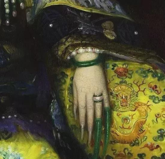 从这张写实油画来看,慈禧老佛爷手上的一双翡翠手镯和设施色泽浓艳、呈满绿色,价值高尚!