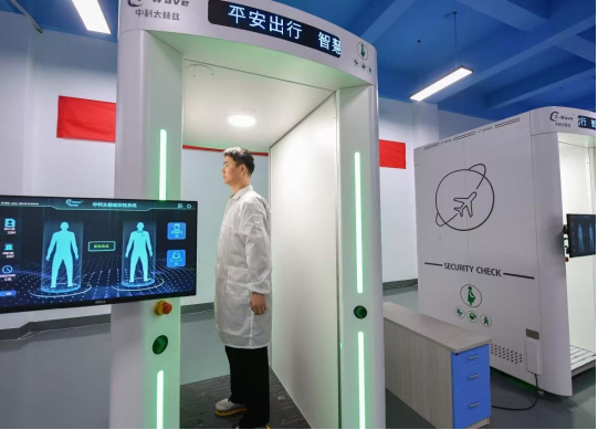 安徽中科太赫兹科技有限公司技艺研发室内,科技东谈主员正在调试太赫兹东谈主体安检设备。 赵明 摄