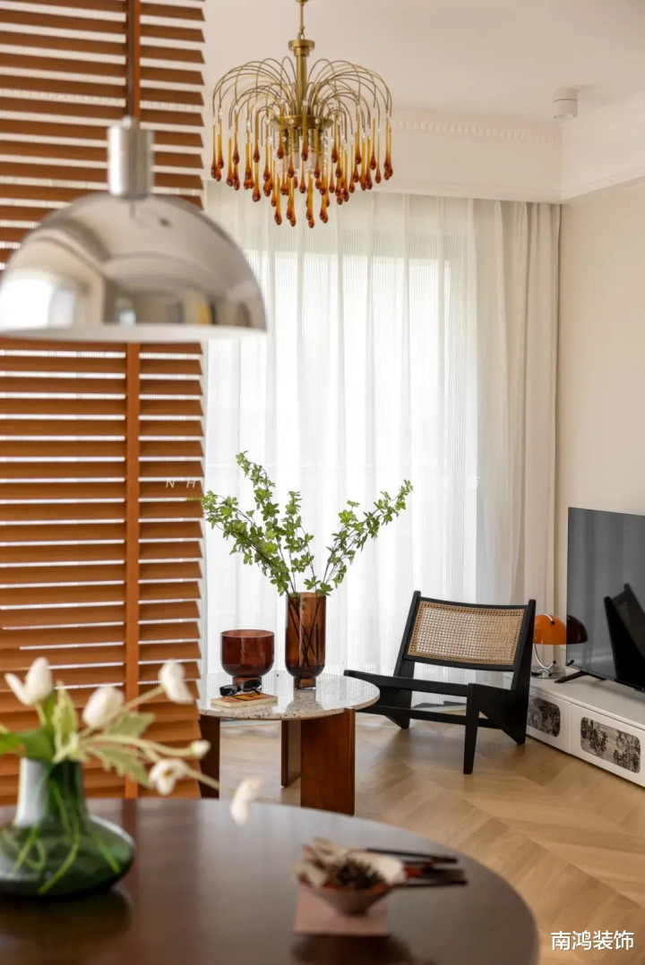 ③居品软装营造出法式氛围感最为时弊,比如黄铜吊灯、相沿静物画、波点/条纹地毯、绿植等,从细节处搭建平方居住的庆典感。